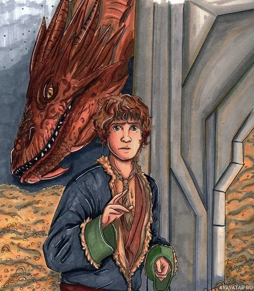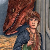 a hobbit character, known for their small stature and hairy feet, standing to the left with his hand raised as if he's pointing or gesturing towards something. On the right side of the frame, there is a large dragon depicted with a menacing expression and