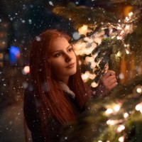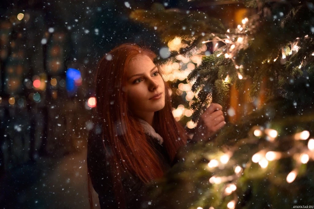 the dark sky and falling snowflakes visible in the background. In her hands, she is holding what looks like an ornament, which could suggest that she might be decorating