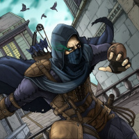 The image shows a character dressed in what appears to be armor and a hood, wearing a mask that covers the lower half of their face. They are depicted with one hand extended forward as if reaching out or gesturing towards something. The setting looks like it could be from