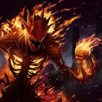 The image depicts a demonic figure with a fiery, skeletal appearance. It is engulfed in flames, suggesting it could be related to themes of fire or destruction. The figure's expression and posture convey aggression and a sense of menace. This character might be associated with infernal elements or the underworld due to its demonic nature and fiery attributes.