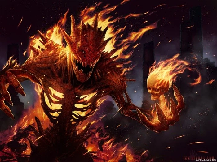 Картинка показывает демоническую фигуру с огненной, скелетной внешностью. Он охвачен пламенем, что позволяет предположить, что он может быть связан с темами огня или разрушения. Выражение и поза фигуры передают агрессию и чувство угрозы. Этот персонаж может быть связан с адскими элементами или подземным миром из-за его демонической природы и огненных атрибутов.