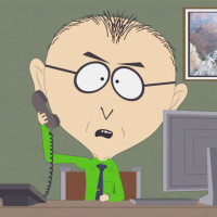 an animated character who appears to be a man sitting at a desk in what looks like an office environment. He is talking on a telephone and seems to be looking frustrated or annoyed, possibly indicating that he's receiving some unfavorable news over