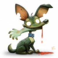 an open palm, which could be interpreted as a gesture of surrender or appeasement. The overall theme seems to be one of horror or suspense, with the zombie label possibly indicating that the dog has been turned into a zombie.