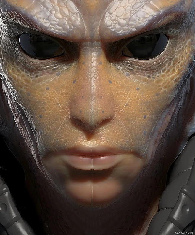 На картинке изображен персонаж, который кажется мутантом. Персонаж имеет рептильную внешность с чешуей, а черты лица не человеческие, а скорее напоминают черты инопланетянина или существа из научно-фантастической обстановки.