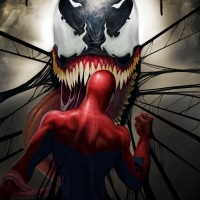 The image depicts a scene featuring Spider-Man and Venom. Spider-Man, recognizable by his red and blue suit, is positioned on the left side of the frame. He appears to be in a posture that suggests he is engaged in combat with another figure, whose face is obscured by darkness. On the right side of the image, the hidden figure is revealed to have the distinctive