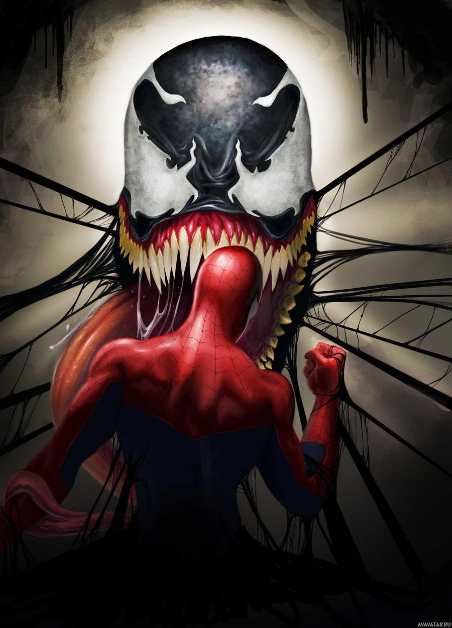 white skull pattern mask associated with Venom. The background has a gothic or horror-themed appearance, with fractures and cracks that give a sense of