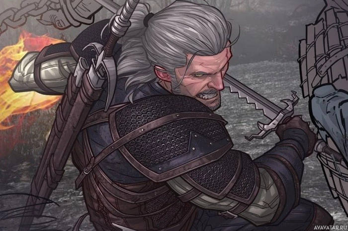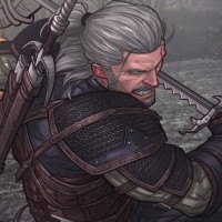 the video game "The Witcher 3: Wild Hunt," known as Geralt. He is standing in what appears to be a battle scenario with glowing effects around him, suggesting he might be using