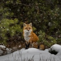 a red fox sitting on top of snow-covered ground. There is also some vegetation visible, possibly pine needles or fir branches, which are common in