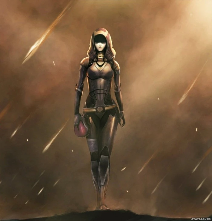 The image features an illustrated character from the "Mass Effect"