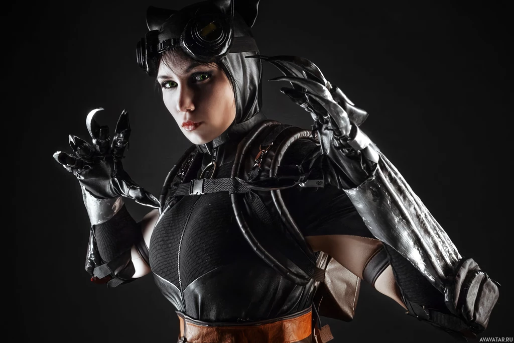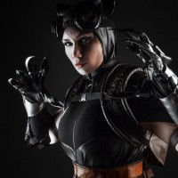 the iconic look of Catwoman, with elements such as leather, armor pieces, and accessories like clawed gloves and a utility belt. The character has