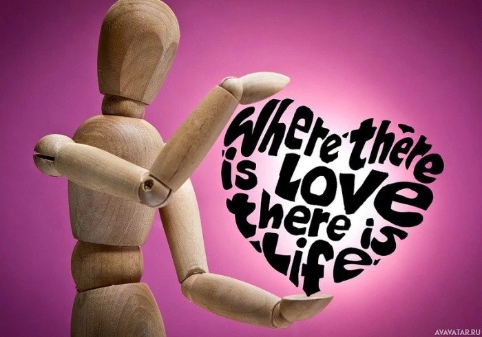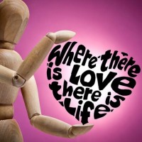 figure of a man and woman, both made of wooden dowels or similar material. They are arranged in such a way that it appears they are embracing each other, with the head of one person resting on the shoulder of the other. Between them is a large heart-shaped graphic with words inside that seem to be part of a poem or song lyrics about love, which includes phrases like "where there is life" and "love." The overall theme of the image appears to be about love and companionship.