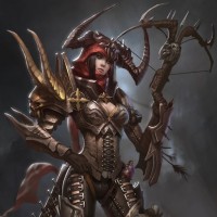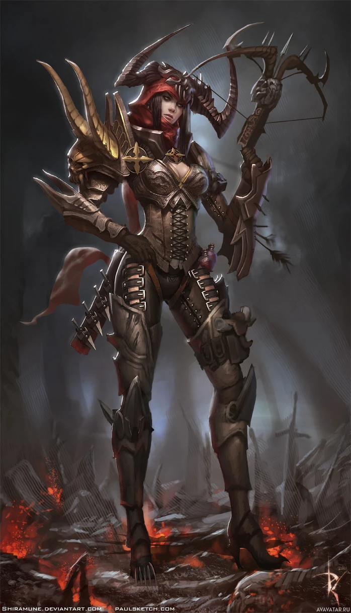 a female figure with demonic horns and sharp claws, wearing armor and holding a bow and quiver of arrows. The setting appears to be a dark or