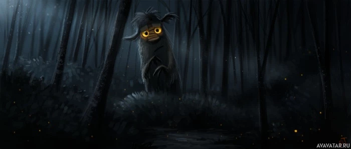 the eerie atmosphere. The surrounding environment is dark with trees silhouetted against