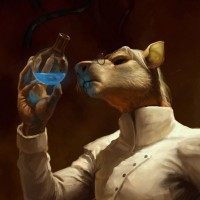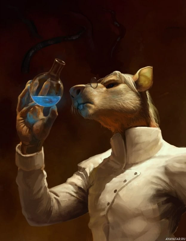 rat character dressed in what appears to be a scientist's outfit, complete with a lab coat and glasses. It is holding a flask that contains