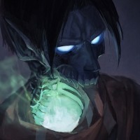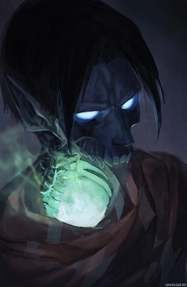 glowing eyes, which suggests some supernatural aspect to their character. The person is holding an object resembling a crystal or magical artifact near their mouth, possibly indicating the consumption of something mystical or part of their