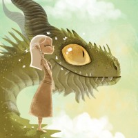 an illustrated scene featuring a human female and a dragon. The
