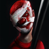 The image shows a stylized illustration of a person wearing a clown mask with
