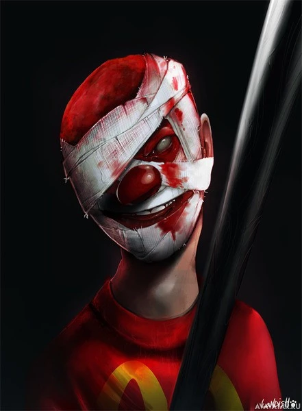 a white stripe over the mouth and nose, reminiscent of classic clown designs. The person is also holding what appears to be a weapon or a long stick in their right hand. The background is dark, which could suggest a horror-themed context for the image. It's important to note that while this illustration may have elements associated with horror or the uncanny, it does not depict any actual violence or harm towards individuals.