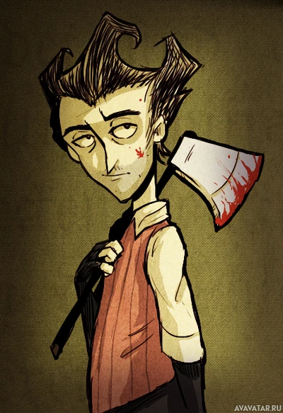 The image features a character holding an axe with blood on it. The character has a somewhat dark and grim expression, which could suggest that they are in the middle of an intense or dangerous situation. The style of the drawing is reminiscent of "Don't Starve," a game known for its pixel