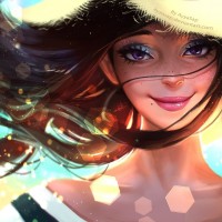 brown hair and is wearing makeup, including lipstick with a shade of pink. She's smiling at the viewer, showing her teeth, which suggests she might be happy or enjoying herself. In front of her, there are some sparkles that add to the playful and vibrant atmosphere of the image. The character is styled in an appealing way, with a sense of