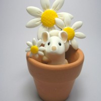 This is an image of a cute little figurine depicting a small mouse inside a ceramic flower pot. The pot has two yellow daisy flowers painted on it, adding to the whimsical nature theme. The mouse seems to be enjoying its cozy home within the flower pot.