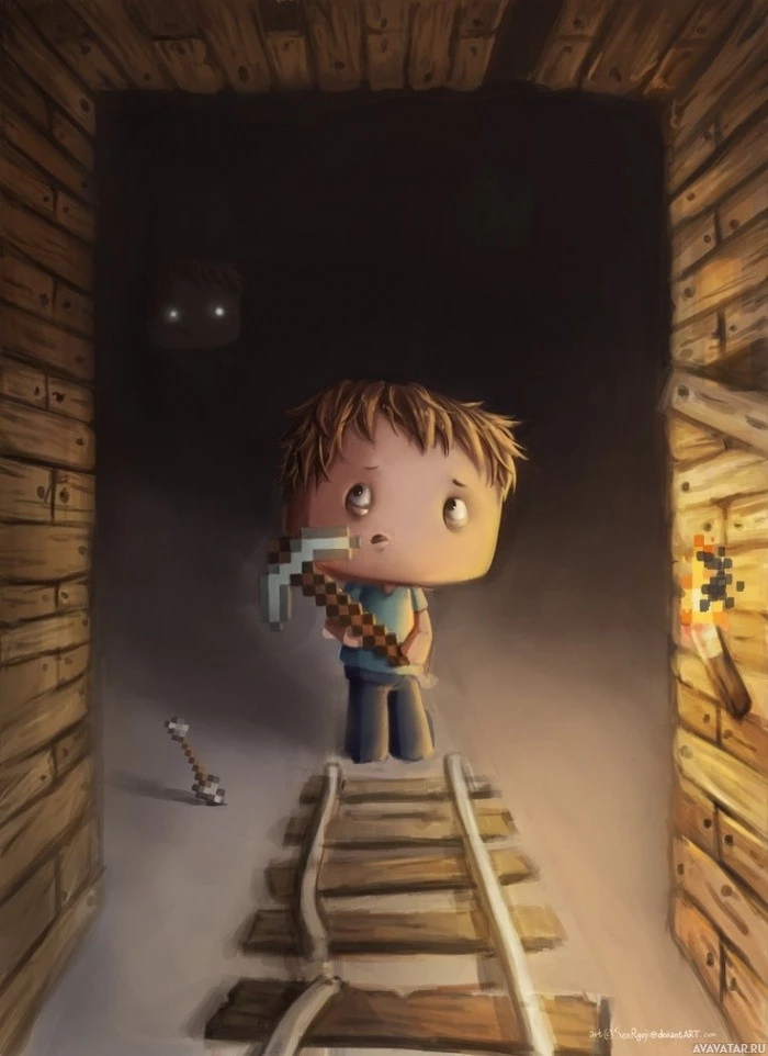 underground setting within the Minecraft universe. The overall atmosphere suggests an adventurous