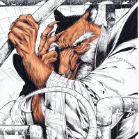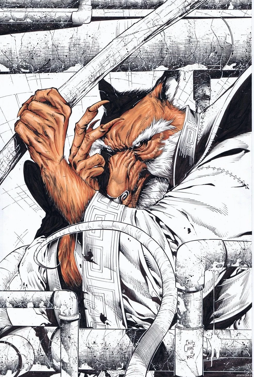 The image depicts an illustration of a character who appears to be a mutant with features resembling both a human and a cat. This character is known as Splinter from the Teenage