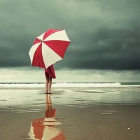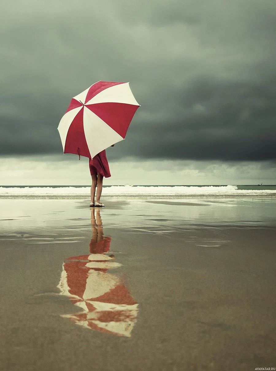 The image features a person standing on the beach. From behind, we can see that it is a girl. She is holding an umbrella, which appears to be red and white in color. The umbrella provides a stark contrast against the backdrop of