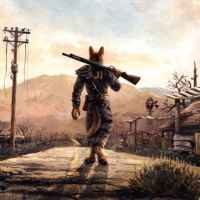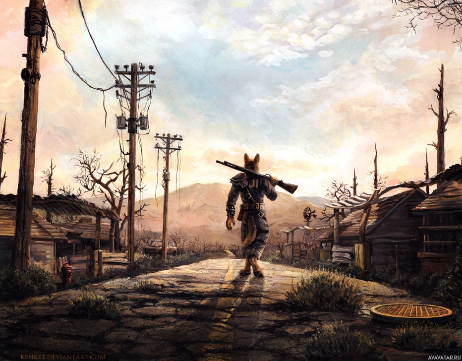 the video game "Fallout" standing in what appears to be a post-apocalyptic landscape. The character is equipped with a weapon, likely a gun, and has