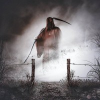 a hooded cloak, which are traditional symbols associated with death. The setting seems eerie and somber, with mist or fog covering the ground and the environment looking abandoned. The Grim Reaper is a symbol often used to represent