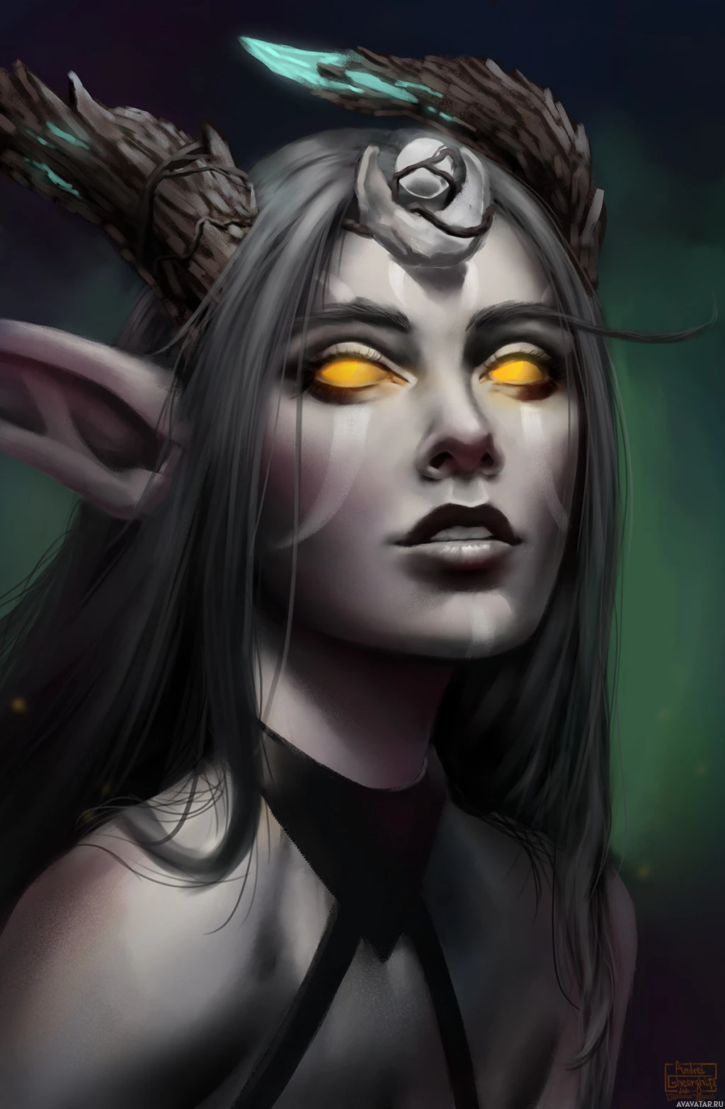 a fantasy character with distinct features. This character has pointed ears, resembling those of an elf or drow (a fictional race), and is wearing what appears to be demonic horns on her head, suggesting she might have