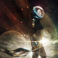 a helmet with a visor, a spacesuit, and possibly a weapon or tool in her hand. There's a glowing light emanating from behind her that enhances
