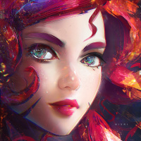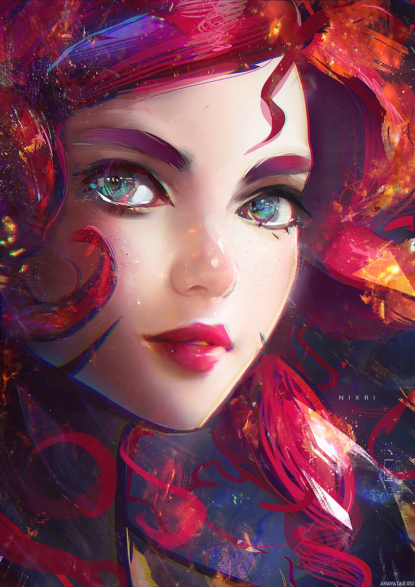 blue eyes and is looking directly at the viewer. Her features are stylized in a way that suggests she might be