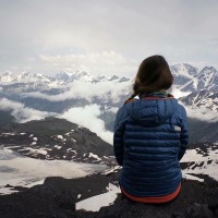 The image depicts a person, specifically a woman, sitting on a snowy mountain top. She is wearing a backpack and appears to be gazing at the majestic mountains in front of her. The setting suggests she might be enjoying a hike or trek, as indicated by the cold-weather attire and outdoor equipment.