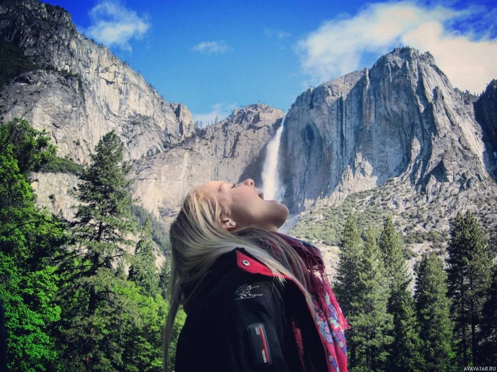 In the picture, there is a girl who appears to be standing in front of a waterfall. She has her arms outstretched and is facing away from the camera, towards the waterfall. The background features