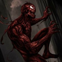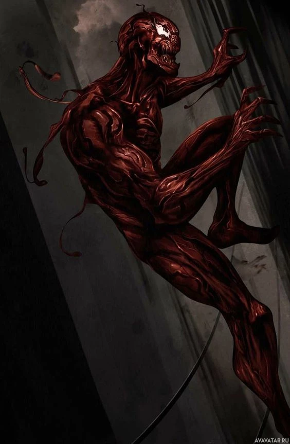 red skin and what appears to be veins or tendons protruding from the surface. This character is often associated with the comic book villain Carnage, who is known for his distinctive appearance and formidable