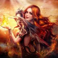 a captivating expression on her face and is holding out what appears to be a flame or fire in one hand while the other arm rests comfortably at her side. The background suggests a chaotic, fiery environment that could imply destruction or