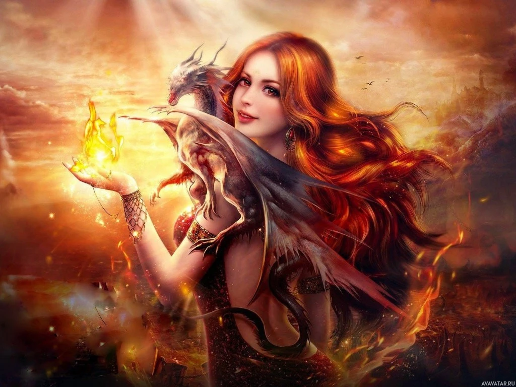 The image depicts a fantasy-themed artwork featuring a red-haired girl with an ethereal appearance. She has