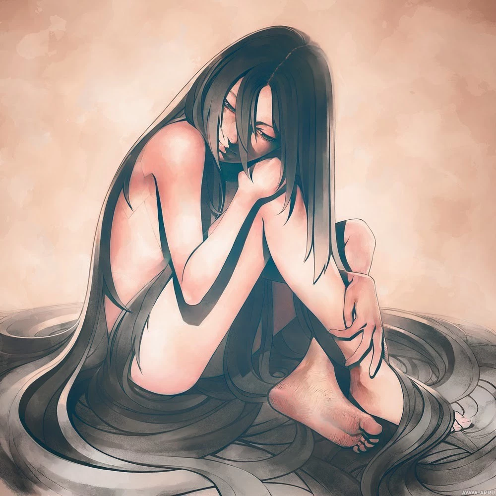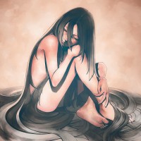 black hair, sitting on the ground. The character appears to be in a contemplative or somber mood, as they are resting their head on one hand while the other hand is gently placed over their lap. The color palette is quite muted, with