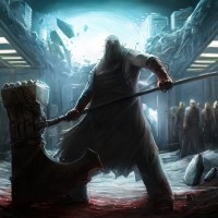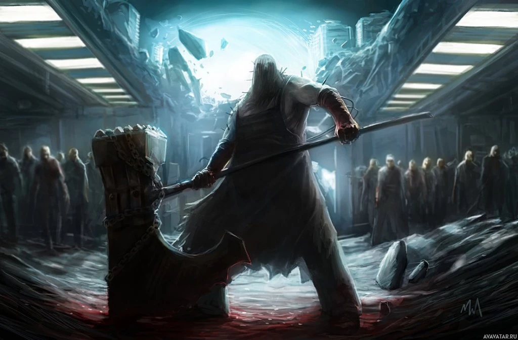 video game or digital art. In the foreground, there is a character wielding an axe and wearing armor that suggests a battle or warrior theme. This character appears to be standing confidently in front of several other characters who are observing him. The setting looks like a dilapidated interior with walls adorned with