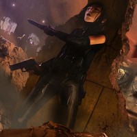 short hair and appears to be wearing a black outfit with tactical gear. The background shows