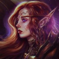 elven attire. Her expression is contemplative, and she seems to be looking off to the side. The background suggests a magical or mystical environment, with swirling purple and black elements that could represent energy or