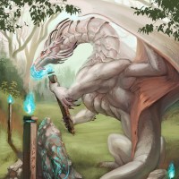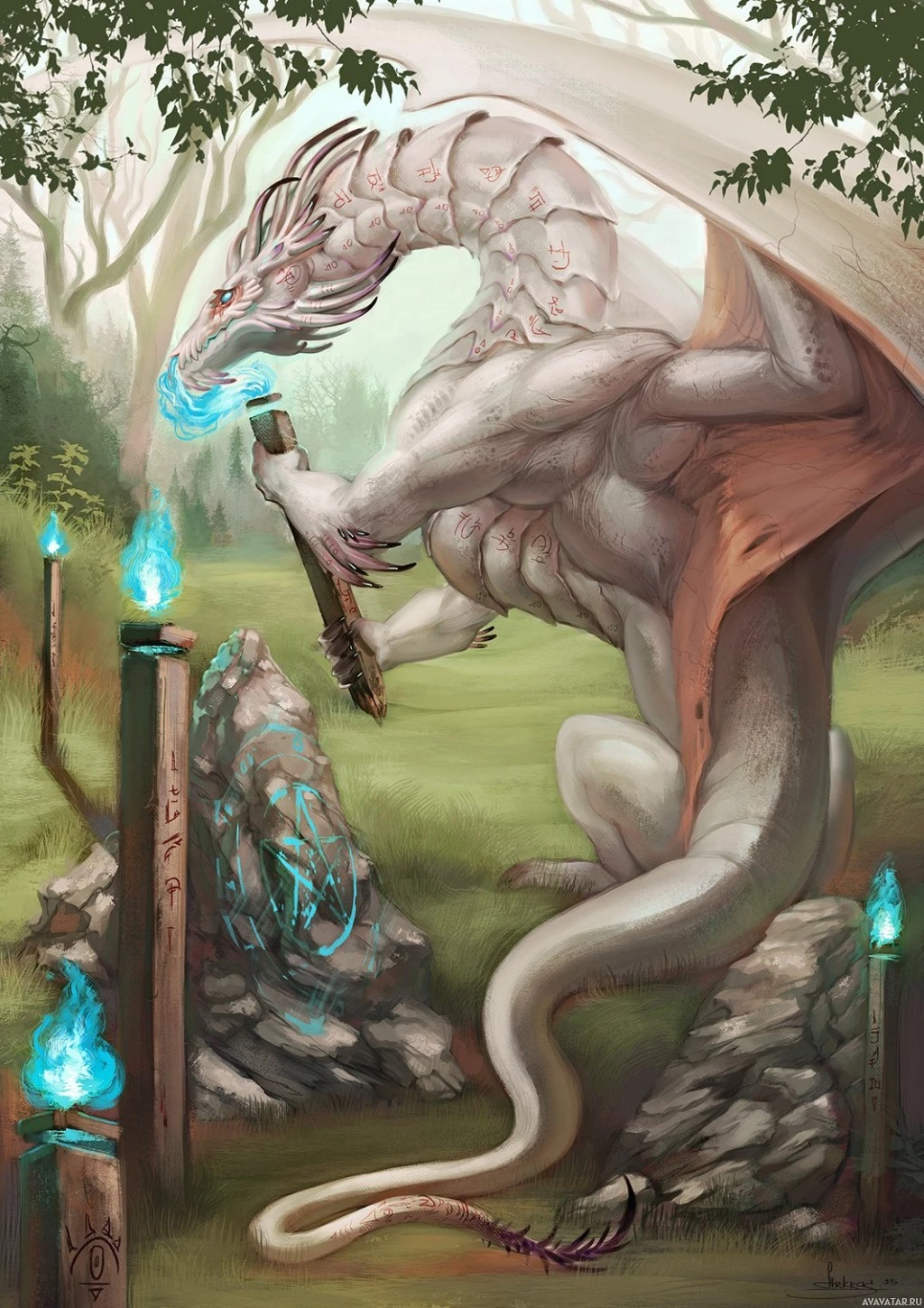 a magical item, and appears to be interacting with it. In front of the dragon, there are rocks arranged in a small circle, and on top of them are lit candles casting