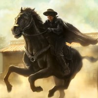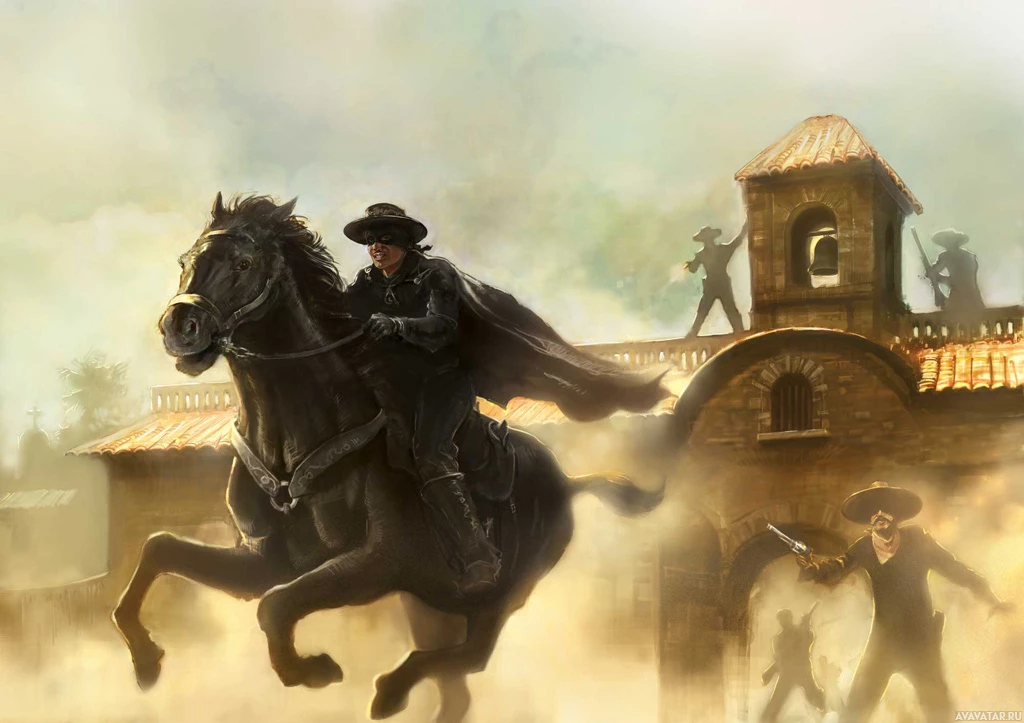 masked vigilante of Spanish origin in a classic Western setting. The character is riding a horse and is dressed in