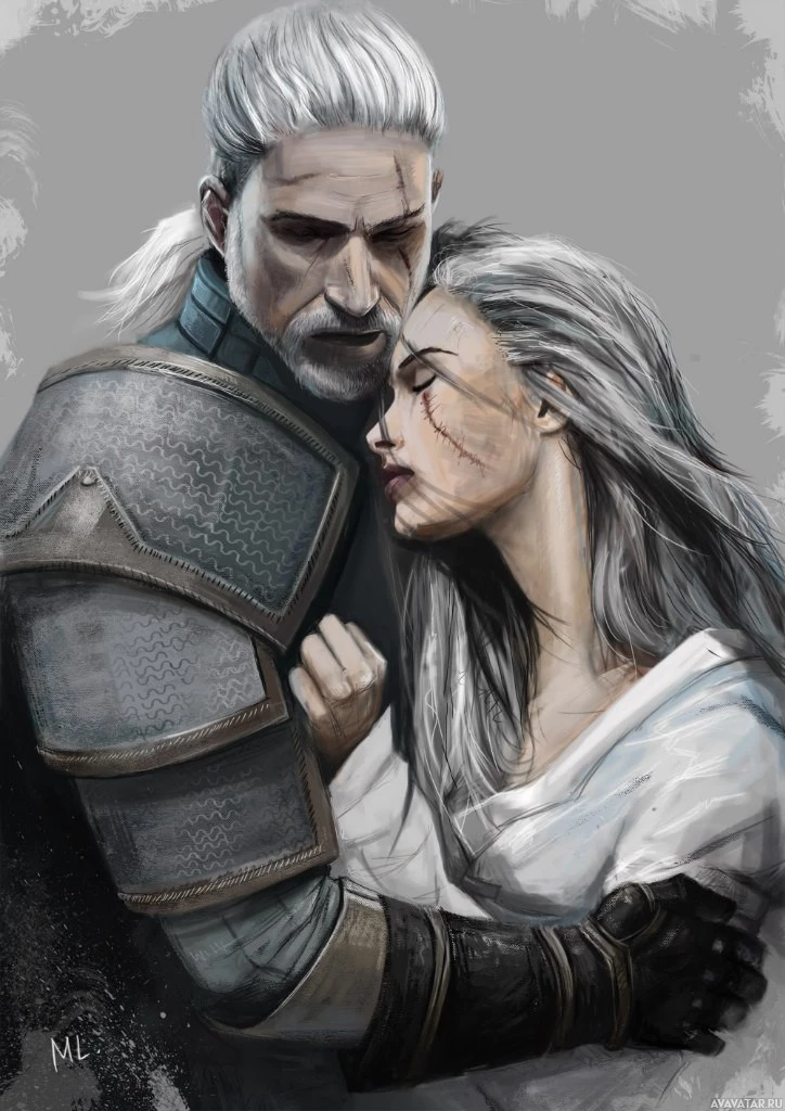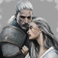 a female character with blonde hair who seems to be in distress or discomfort; this character is not specifically named but is commonly referred to as Ciri in fan discussions of the game. The two characters are close together and appear to be having