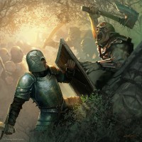 the soft illumination. The image captures a moment of confrontation between different factions in this fictional realm.