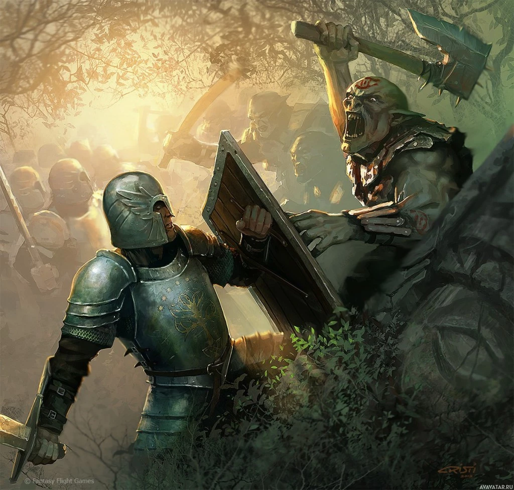 a defensive posture, wearing a helmet that has two protruding tusks. The orc seems to be looking towards the warrior, possibly responding to his challenge. 3. In the background on the right, there are several other