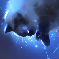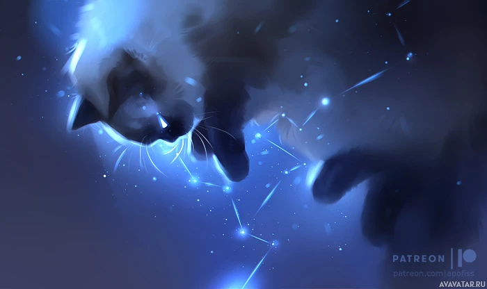 a night sky, and there are various stars scattered throughout the scene, enhancing the cosmic theme. The cat appears calm and focused while surrounded by these ethereal elements, creating