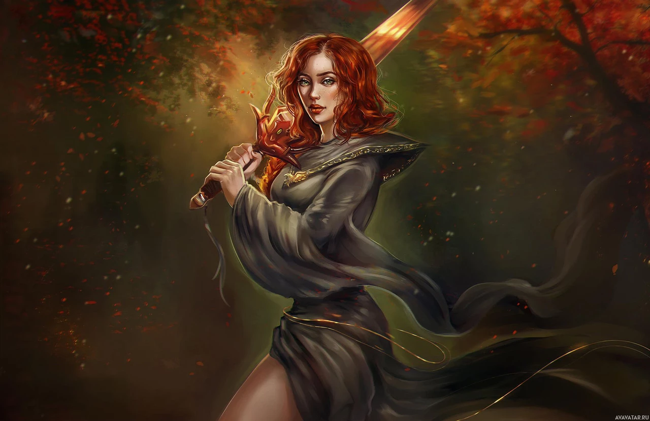 red hair. She is holding a sword in her right hand and appears to be standing amidst autumn leaves, suggesting
