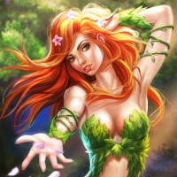 red hair and green skin adorned with leaves, which are typical characteristics of the Poison Ivy persona. She is wearing a costume that complements her plant-themed powers and is set against